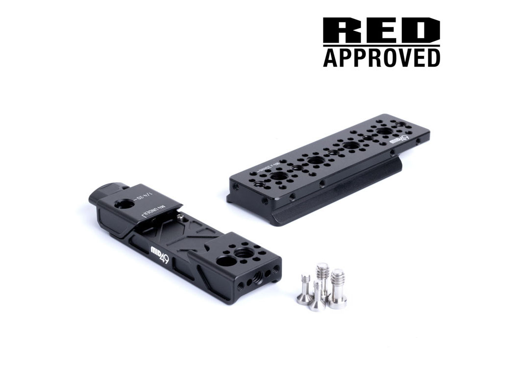 ARCA Top Mount (RED Komodo, Komodo-X, V-Raptor) attaches to two 1/4-20 screws on the top of Komodo, Komodo-X, and V-Raptor cameras. On Komodo-X, two included M4 screws can be used to attach the Top Mount to the rear portion of the camera top.