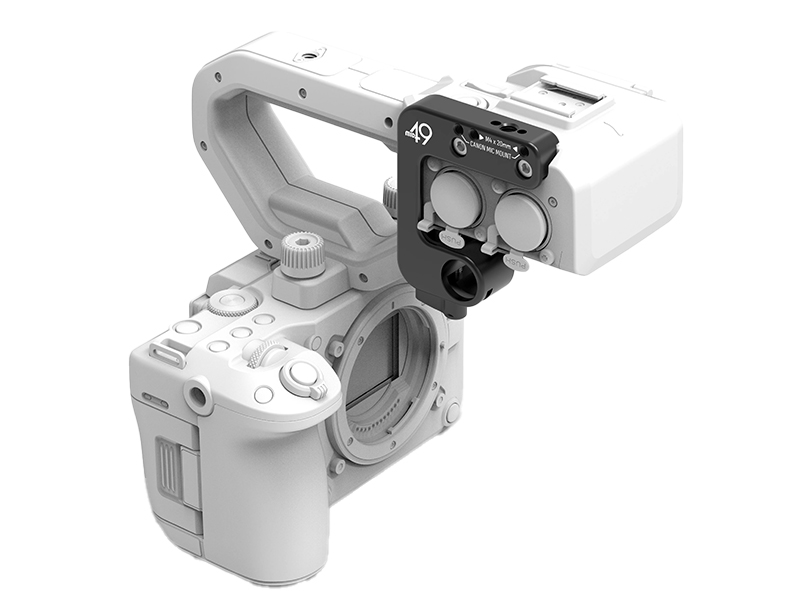 Canon C50 15mm Rod Clamp attaches to the two M4 holes on the front of the handle where the microphone shockmount would normally be installed.